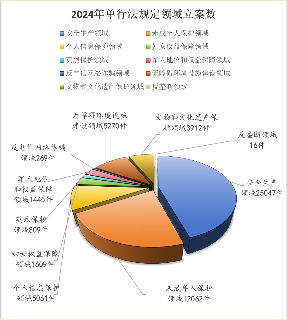 从单行法规定领域看,安全生产25047件,未成年人保护12062件,个人信息保护5061件,妇女权益保障1609件,英烈保护809件,军人地位和权益保障1445件,反电信网络诈骗269件,无障碍环境建设5270件,文物保护3912件,反垄断16件。