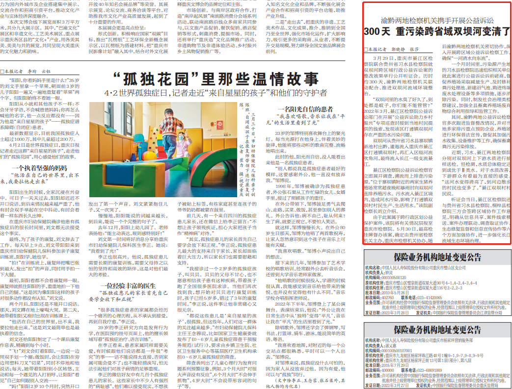 2023年4月3日,《重庆日报》第5版刊登《渝黔两地检察机关携手开展公益诉讼——300天 重污染跨省域双坝河变清了》一文,内容如下: