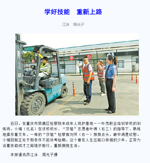 近日,在重庆市荣昌区检察院未成年人观护基地——叶茂职业培训学校的训练场,小瑞(化名)在该校校长、“莎姐”志愿者叶锡(右三)的指导下,熟练地操作着叉车,一旁的“莎姐”检察官刘芳(右一)频频点头,眼中满是欣慰。小瑞目前正处于附条件不起诉考验期,这个曾在人生岔路口徘徊的少年,正努力沿着技能成才之路稳步前行,重新拥抱生活。