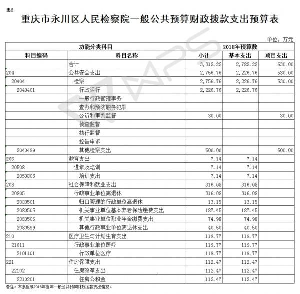 2018年一般公共预算财政拨款收入3312.22万元,一般公共预算财政拨款支出3312.22万元,比2017年减少76.45万元。其中:基本支出2782.22万元,比2017年增加95.5万元,主要原因是人员政策性增资和支出结构调整,主要用于保障在职人员工资福利及社会保险缴费,离休人员离休费及生活补助,保障部门正常运转的办公费及印刷费、邮电费等各项商品服务支出;项目支出530万元,比2017年减少171.95万元,主要原因是支出结构调整,主要用于公诉和审判监督、侦查监督、执行监督、控告申诉等重点工作。