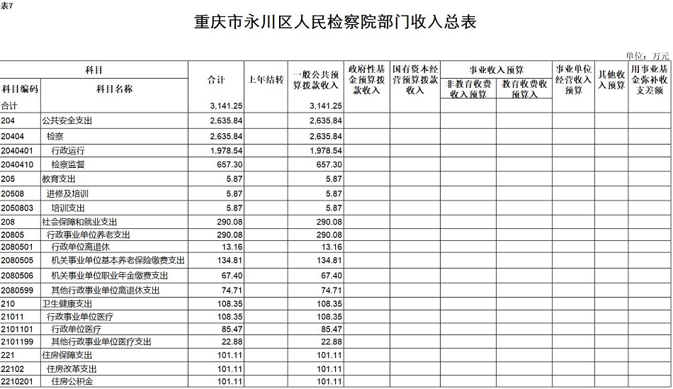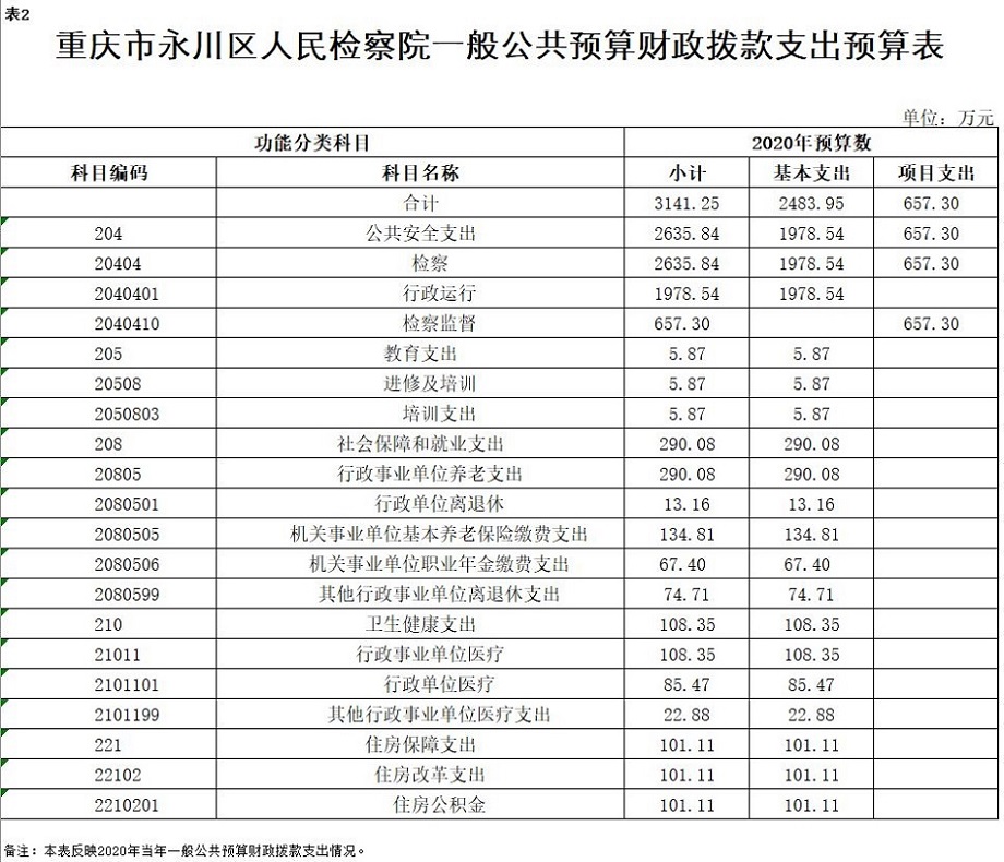2020年一般公共预算财政拨款收入3141.25万元,一般公共预算财政拨款支出3141.25万元,比2019年减少123.6万元。其中:基本支出2483.95万元,比2019年减少365.45万元,主要原因是监察体制改革转隶人员划转,其相应的人员经费、日常公用经费预算减少,主要用于保障在职人员工资福利及社会保险缴费,离休人员离休费,退休人员补助等,保障部门正常运转的各项商品服务支出;项目支出657.3万元,比2019年增加241.85万元,主要原因一是2020年增加了办案区改造一次性项目,二是提高了年初预算到位率,主要用于公诉和审判监督、侦查监督、公益诉讼、执行监督、控告申诉、办案区改造等重点工作。