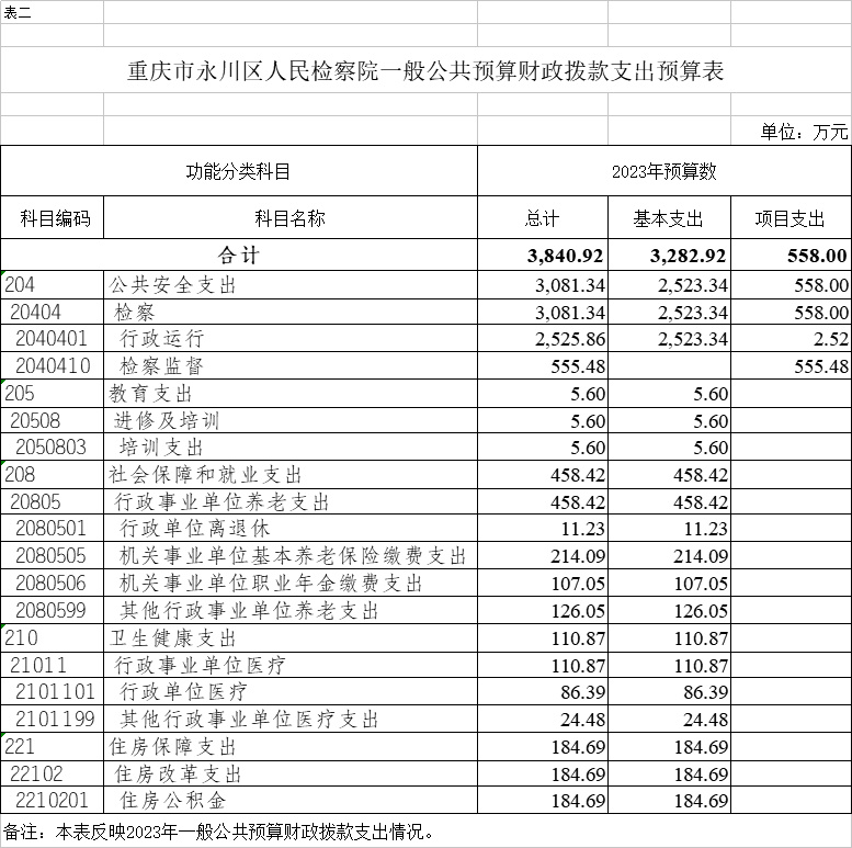 (二)支出预算:2023年年初预算数3840.92万元,其中:公共安全支出3081.34万元,教育支出5.6万元,社会保障和就业支出458.42万元,卫生健康支出110.87万元,住房保障支出184.69万元;支出较去年增加263.03万元,主要是基本支出预算增加754.83万元,项目支出预算减少491.8万元。