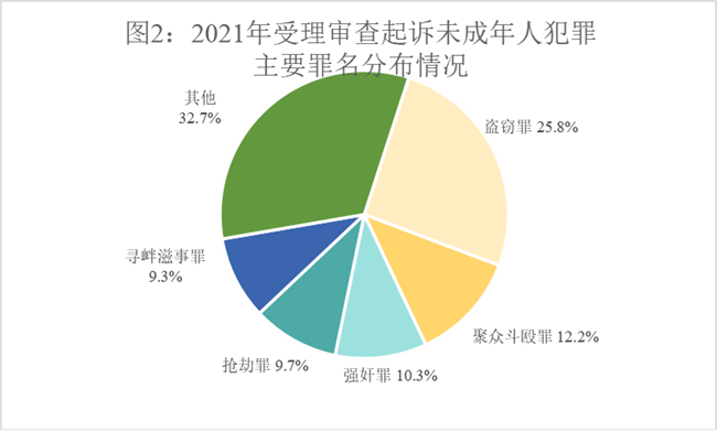 (1)未成年人犯罪数量出现反弹。2017年至2021年,检察机关受理审查逮捕未成年犯罪嫌疑人数分别为42413人、44901人、48275人、37681人、55379人,受理审查起诉未成年犯罪嫌疑人数分别为59593人、58307人、61295人、54954人、73998人。2021年受理审查逮捕、受理审查起诉人数较2017年分别上升30.6%、24.2%。