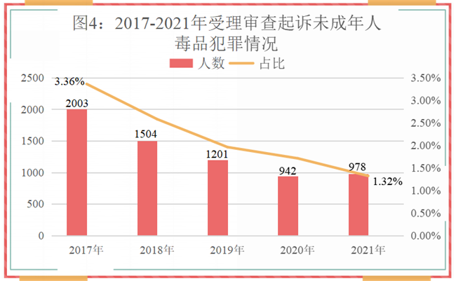 (4)未成年人毒品犯罪占比持续下降。2017年至2021年,检察机关受理审查起诉未成年人毒品犯罪分别为2003人、1504人、1201人、942人、978人,分别占同期受理审查起诉未成年犯罪嫌疑人数的3.36%、2.58%、1.96%、1.71%、1.32%,2021年较2017年人数下降50.67%。