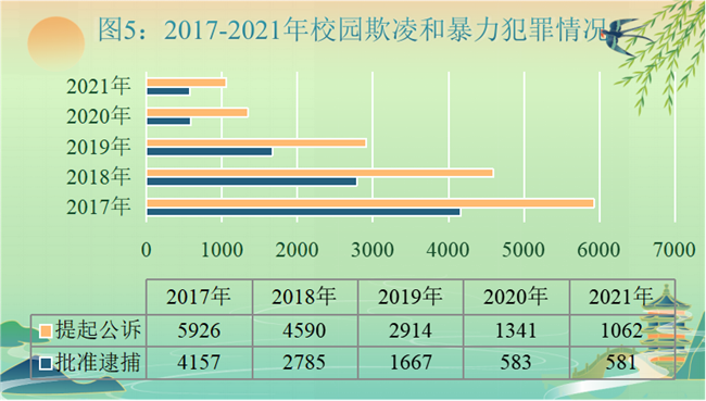 (5)校园欺凌和暴力犯罪数量继续下降。2017年至2021年,检察机关批准逮捕校园欺凌和暴力犯罪人数分别为4157人、2785人、1667人、583人、581人,提起公诉人数分别为5926人、4590人、2914人、1341人、1062人,呈逐年下降趋势。2021年批捕、起诉人数分别较2017年下降86.02%、82.08%。