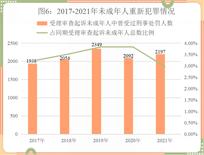 (6)未成年人重新犯罪率有所下降。2017年至2021年,检察机关受理审查起诉未成年人中曾受过刑事处罚的分别为1938人、2054人、2349人、2092人、2197人,分别占同期受理审查起诉未成年人总数的3.25%、3.52%、3.83%、3.83%、2.97%,反映对涉罪未成年人的教育挽救效果有所提升。