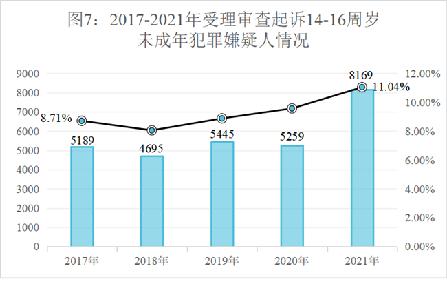 (7)未成年人犯罪呈现低龄化趋势。2017年至2021年,检察机关受理审查起诉14至16周岁未成年犯罪嫌疑人数分别为5189人、4695人、5445人、5259人、8169人,分别占受理审查起诉未成年人犯罪总数的8.71%、8.05%、8.88%、9.57%、11.04%。从犯罪人数看,2021年较2017年增加2980人,增幅达57.4%。