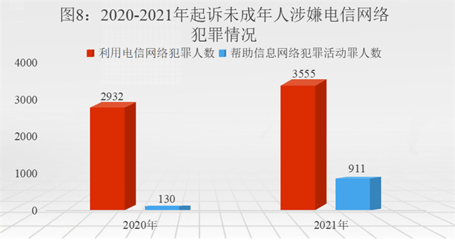 (8)未成年人涉电信网络犯罪上升较快。2019年、2020年、2021年检察机关分别起诉未成年人涉嫌利用电信网络犯罪2130人、2932人、3555人,同比分别上升37.65%、21.25%。其中,未成年人涉嫌帮助信息网络犯罪活动罪明显上升,2020年起诉130人、2021年起诉911人,同比上升6倍。