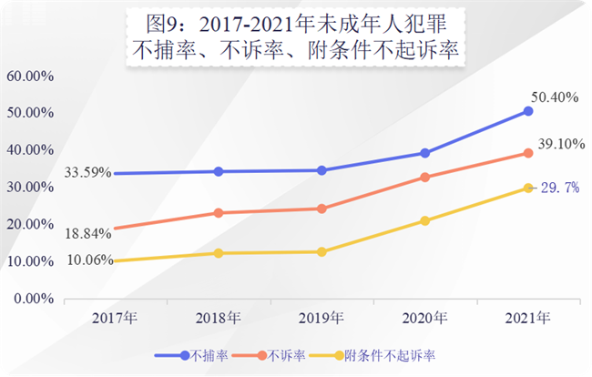 (2)未成年人犯罪不诉率持续上升。2017年至2021年,检察机关分别对未成年犯罪嫌疑人不起诉10114人、11865人、13752人、16062人、22585人,不起诉率分别是18.84%、22.99%、24.13%、32.59%、39.1%,2021年不诉率同比增加6.5个百分点。