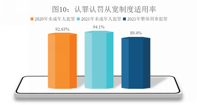 (4)未成年人犯罪案件认罪认罚从宽制度适用率高。2021年,检察机关对未成年人犯罪案件适用认罪认罚从宽制度61403人,适用率为94.1%,同比增加1.47个百分点,高于同期刑事犯罪整体适用率4.7个百分点,反映出认罪认罚从宽制度与未成年人司法理念高度契合,在未成年人犯罪案件中适用情况更好。
