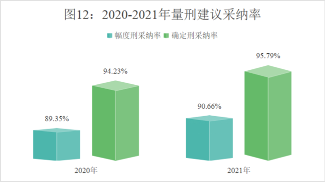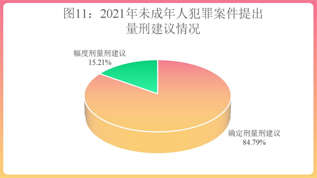 (5)确定刑量刑建议适用率、采纳率高。2021年检察机关针对未成年人犯罪提出量刑建议27874人,其中确定刑量刑建议23635人、幅度刑量刑建议4239人,分别占84.79%、15.21%。量刑建议被采纳26483人,采纳率95.01%,其中确定刑、幅度刑量刑建议分别采纳22640人、3843人,采纳率分别为95.79%和90.66%,分别较2020年增加1.56、1.31个百分点。