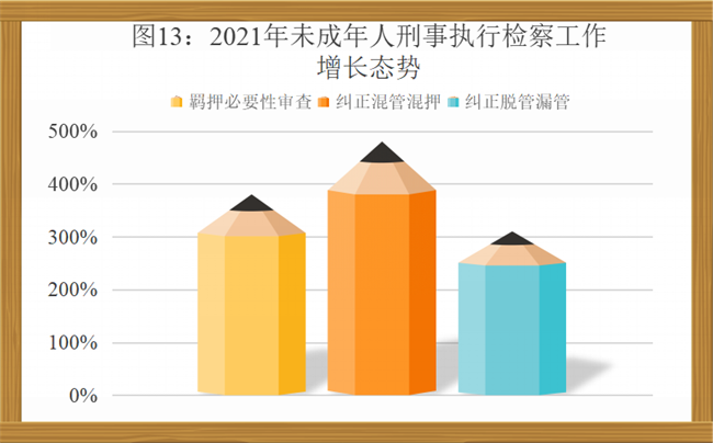 (6)未成年人刑事执行检察监督力度加大。2021年,检察机关共对20045名涉罪未成年人开展羁押必要性审查,同比上升3.8倍。审查起诉阶段直接释放或者变更强制措施2689人,侦查阶段提出释放或变更强制措施建议被采纳1421人,审判阶段提出释放或变更强制措施建议被采纳352人。