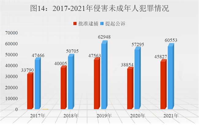 (1)侵害未成年人犯罪总体呈上升趋势。2017年至2021年,检察机关批准逮捕侵害未成年人犯罪分别为33790人、40005人、47563人、38854人、45827人,同期提起公诉47466人、50705人、62948人、57295人、60553人,2021年分别较2017年上升35.62%、27.57%。