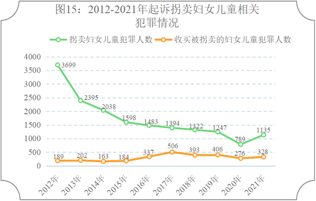 (2)拐卖妇女儿童犯罪呈下降趋势。2012年至2021年,检察机关起诉拐卖妇女儿童犯罪分别为3699人、2395人、2038人、1598人、1483人、1394人、1322人、1247人、789人、1135人,2021年较2012年下降69.32%,年均下降12.3%。同期起诉收买被拐卖的妇女儿童犯罪分别为189人、202人、163人、184人、337人、506人、393人、406人、276人、328人,2021年较2012年上升73.54%,年均上升6.3%。