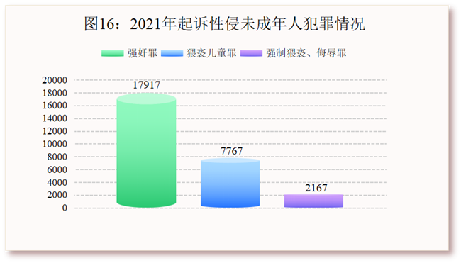 (3)性侵未成年人犯罪增幅趋于平缓。2021年,检察机关起诉强奸未成年人犯罪17917人,同比上升16.61%,增幅为近四年来最低。同期,起诉猥亵儿童犯罪7767人,同比上升32.09%,起诉强制猥亵、侮辱未成年人犯罪2167人。