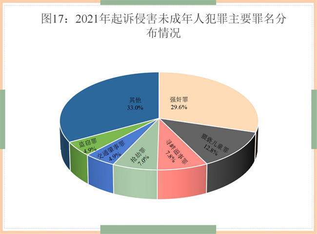 (4)侵害未成年人犯罪类型更加集中。2021年,检察机关对侵害未成年人犯罪提起公诉人数居前六位的分别是强奸罪、猥亵儿童罪、寻衅滋事罪、抢劫罪、交通肇事罪、盗窃罪,以上六类犯罪共计40612人,占提起公诉人数的67.07%,较2020年增长4.64个百分点。
