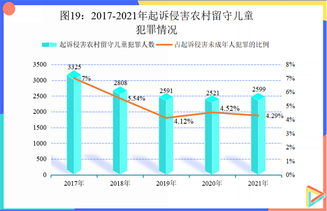 (6)侵害农村留守儿童犯罪总体趋缓。2017年至2021年,检察机关起诉侵害农村留守儿童犯罪人数分别为3325人、2808人、2591、2521人、2599人,分别占侵害未成年人犯罪人数的7%、5.54%、4.12%、4.52%、4.29%。