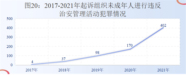 (7)组织未成年人进行违反治安管理活动犯罪增幅较大。2017年至2021年,检察机关对组织未成年人进行违反治安管理活动犯罪提起公诉分别为4人、37人、98人、170人、402人,近三年分别上升164.86%、73.47%、136.47%,反映组织、拉拢未成年人进行违法犯罪问题不容忽视。