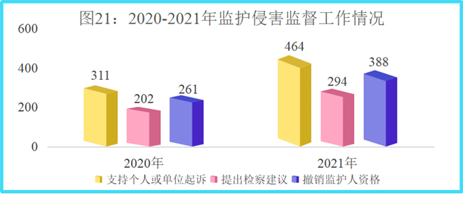 (1)加强监护侵害监督。2021年,对于符合撤销监护人资格条件的,检察机关支持个人或单位起诉464件,同比上升49.2%;提出检察建议294件,同比上升45.54%;撤销监护人资格388件,同比上升48.66%。