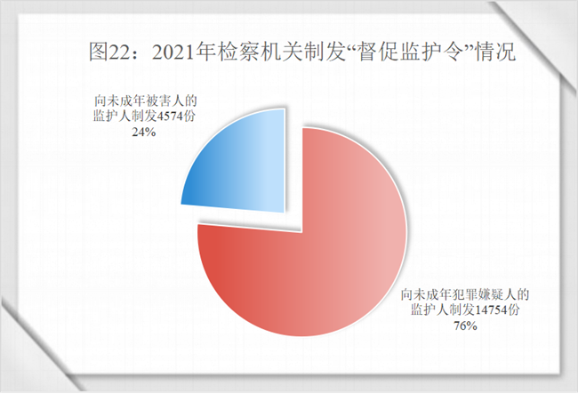 (3)开展“督促监护令”工作。自2021年6月1日起,针对家庭监护缺位问题,检察机关在办理涉未成年人案件中开展“督促监护令”工作,共制发“督促监护令”19328份,其中向未成年犯罪嫌疑人的监护人制发“督促监护令”14754份,向未成年被害人的监护人制发“督促监护令”4574份。