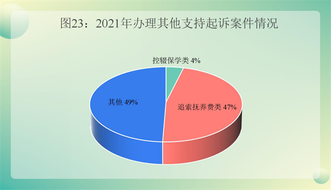 (4)积极开展支持起诉工作。2021年,检察机关共办理除监护权监督以外的支持起诉案件1660件,其中追索抚养费类776件,控辍保学类65件,其他819件。