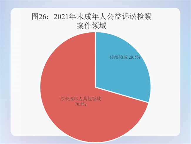 (5)案件领域情况。检察机关办理涉未成年人食品药品安全、生态环境保护等传统领域公益诉讼案件1957件,占29.5%。办理产品质量、烟酒销售、文化宣传、网络信息传播、个人信息保护、儿童游乐场所设施安全、娱乐游戏、文身、点播影院、爱国主义教育基地等涉未其他领域案件4676件,占70.5%。