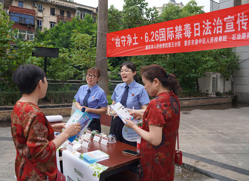 日前,在第38个国际禁毒日来临之际,重庆市检察院第五分院、渝中区人民检察院的检察官们依托“平安渝中”网格接待日平台,在石油路街道彭家花园社区支起了禁毒“摊位”,主动向社区群众派发宣传手册、图文并茂讲解禁毒知识,普及禁毒法律法规,引导群众抵制毒品、珍爱生命。