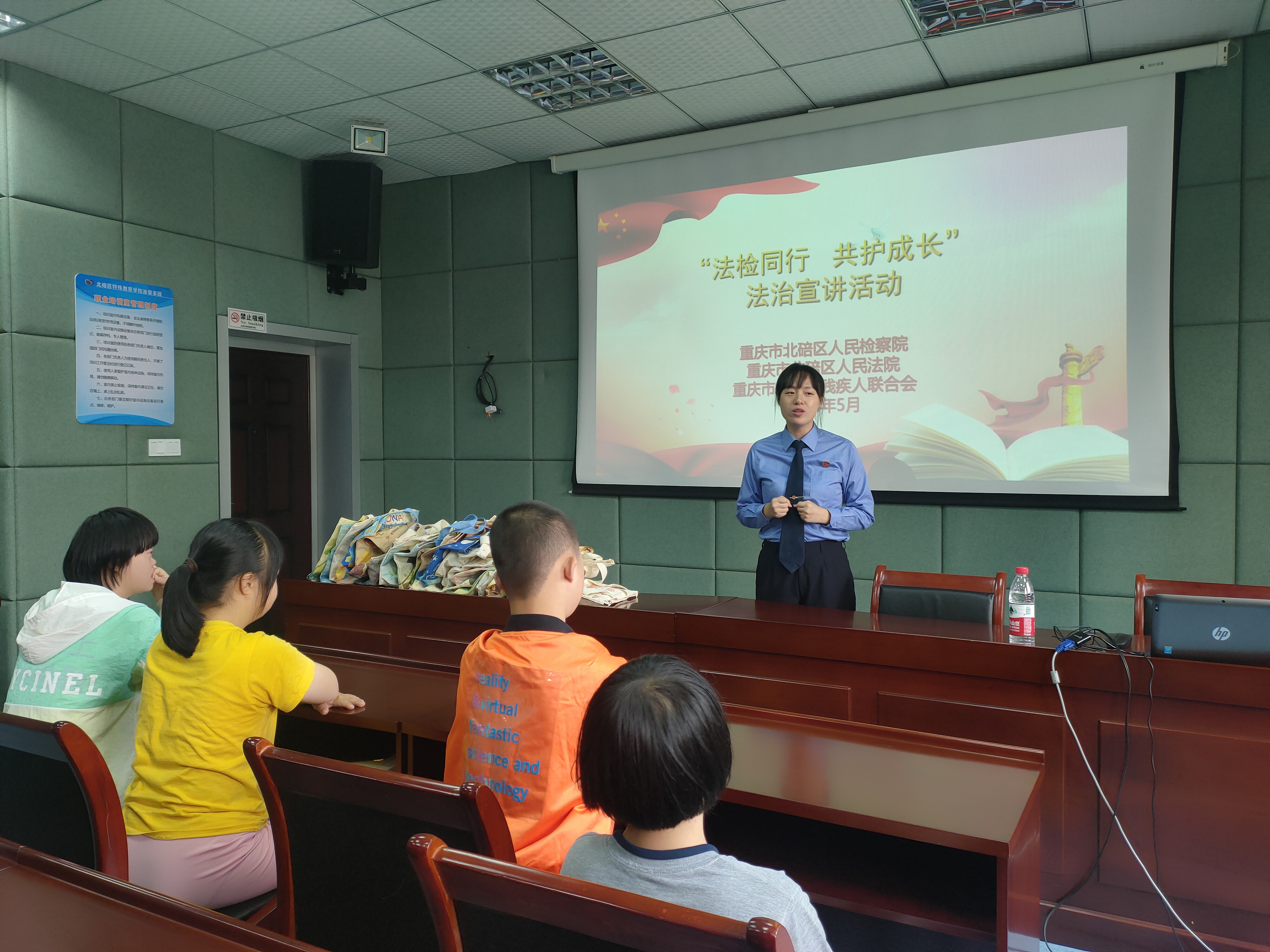 为深入开展“检护成长”专项行动,5月30日,北碚区检察院联合区法院、区残联在六一国际儿童节前夕来到北碚区特殊教育学校,携手开展“法检同行 共护成长”法治宣传活动。活动现场,北碚区检察院未检干警利用深入浅出的语言,结合真实案例和普法动漫开展宣讲,从“防性侵、防欺凌”两个方面,引导同学们提升自护意识、友好与人相处,并为特殊教育学校的孩子们送上了节日慰问。