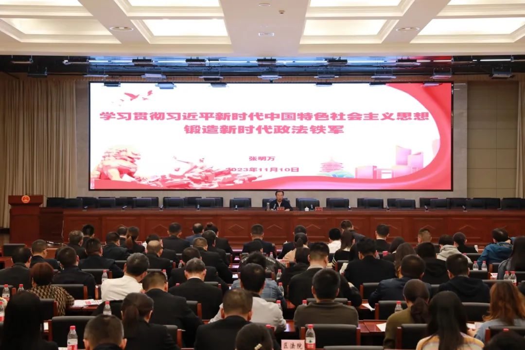 报告结束后,张明万以“学习贯彻习近平新时代中国特色社会主义思想 锻造新时代政法铁军”为主题,围绕习近平总书记对政法队伍提出的“五个过硬”要求讲专题党课。他指出,落实好“五个过硬”,是锻造新时代忠诚干警担当政法铁军的魂、根和本。一是政治过硬。政法干部干警必须把政治忠诚作为第一要求,把旗帜鲜明讲政治作为第一标准,把“坚持党的绝对领导”作为政法工作的最高原则。二是业务过硬。政法机关工作具有高负荷、高对抗、高压力、高风险等特点,需要政法干警既要政治过硬又要本领高强,提升“八个方面”执政本领。三是责任过硬。政法干部干警要做到敢于斗争、勇于担当、善于落实,履行好“维护国家政治安全、确保社会大局稳定、促进社会公平正义”这四大职责使命。四是纪律过硬。政法队伍本质上是纪律部队,广大干警要将遵守纪律铭刻在灵魂中,牢记法律红线不可逾越,以铁的纪律带出一支铁的队伍。五是作风过硬。政法干警要严格约束个人生活作风和职业操守,坚持做人、处事、用权底线,慎独慎初慎微慎欲,增强拒腐防变的免疫力。