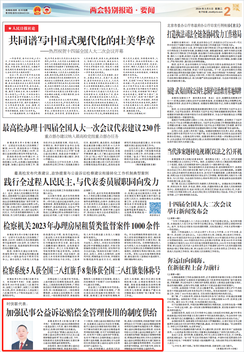 2024年3月5日,《检察日报》第2版“两会特别报道·要闻”专栏刊登《时侠联代表:加强民事公益诉讼赔偿金管理使用的制度供给》一文,内容如下: