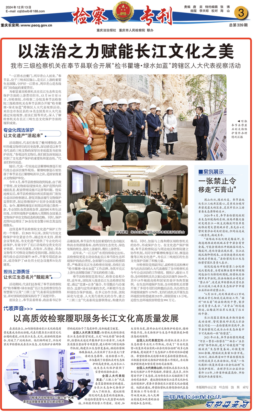 2024年12月13日,《重庆法治报》第3版刊登《以法治之力赋能长江文化之美——我市三级检察机关在奉节县联合开展“检书瞿塘·绿水如蓝”跨辖区人大代表视察活动》一文,内容如下:
