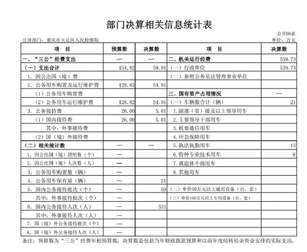 (一)“三公”经费支出总体情况说明。2018年度本部门“三公”经费支出共计59.91万元,较年初预算数减少94.91万元,下降61.30%,主要原因根据渝财资产〔2018〕10号划转区监察委公务用车6辆,车辆保有量减少、公务用车运行维护费降低。加之严格落实公车使用规定,严禁公车私用,公务用车运行维护费支出大幅下降。强化公务接待支出管理,严格遵守公务接待开支范围和开支标准,严格控制陪餐人数,对应由接待对象承担的费用一律由接待对象自行支付,公务接待费大幅下降。较上年支出数减少47.57万元,下降44.26%,主要原因是一是认真贯彻落实中央“八项规定”精神和厉行节约要求,按照只减不增的要求从严控制三公经费,全年实际支出较预算和决算均有大幅下降。二是根据渝财资产〔2018〕10号划转区监察委公务用车6辆,同时严格落实公车使用规定,严禁公车私用,公车运行维护成本大幅下降。三是强化公务接待支出管理,严格遵守公务接待开支范围和开支标准,严格控制陪餐人数,对应由接待对象承担的费用一律由接待对象自行支付,公务接待费大幅下降。四是进一步规范因公出国(境)活动,今年未安排单位人员出国出访。