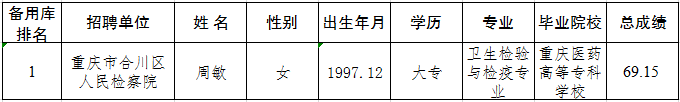 根据《重庆市检察机关公开招聘聘用制书记员简章》的规定,因工作需要,拟从“备用人员库”中按照考生总成绩由高到低顺序补充招聘1名聘用制书记员,现予以公示。