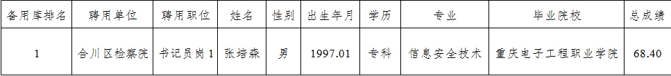 第一分院及辖区检察院公开招聘聘用制书记员简章》中关于“建立备用人员库”的规定,我院拟从库中按考试总成绩从高到低的顺序,补充招聘1名“书记员岗1”聘用制书记员,现予以公示。经公示无异议或反映问题不影响聘用的,将按程序聘用为我院聘用制书记员。