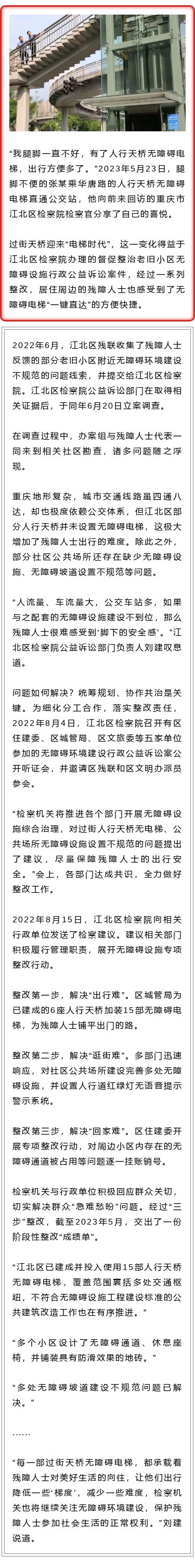 【我为群众办实事】江北:老旧小区过街天桥迎来“电梯时代”,检察建议守护残障人士安全出行