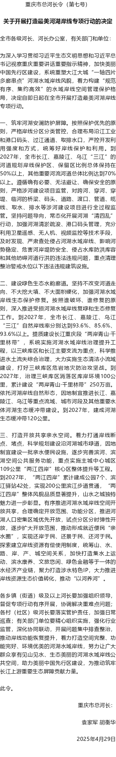 重庆市总河长令(第七号) 关于开展打造最美河湖岸线专项行动的决定