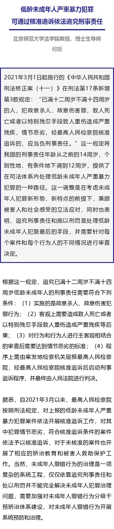 专家解读:低龄未成年人严重暴力犯罪可通过核准追诉依法追究刑事责任