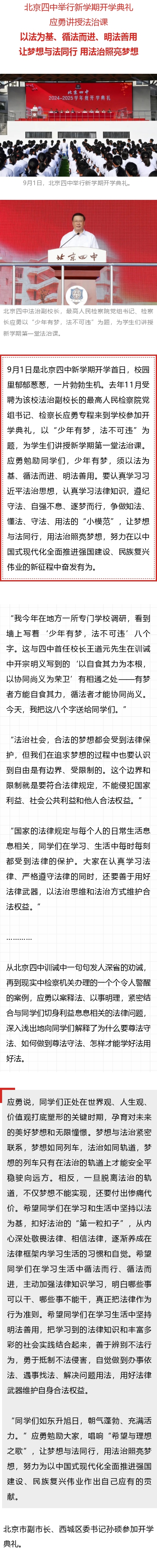 少年有梦,法不可违!应勇在北京四中开学典礼上讲授法治课