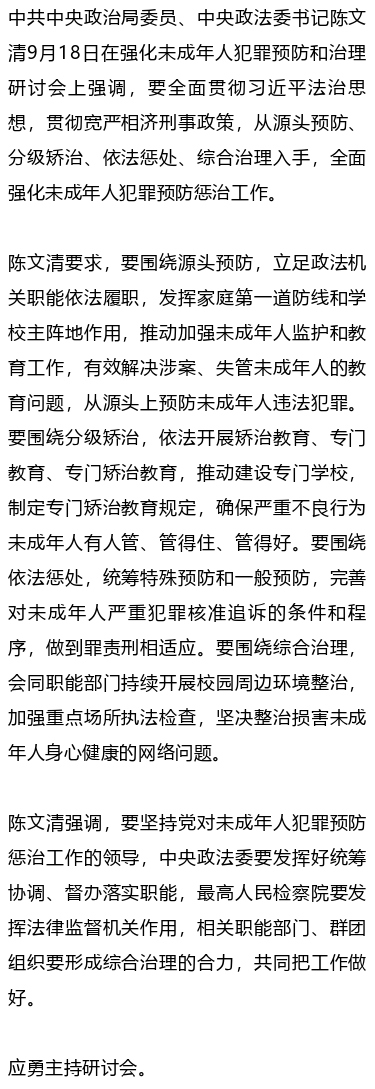 陈文清在强化未成年人犯罪预防和治理研讨会上强调 坚持宽严相济 加强综合治理 全面强化未成年人犯罪预防惩治工作