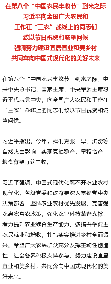 习近平向全国广大农民和工作在“三农”战线上的同志们致以节日祝贺和诚挚问候