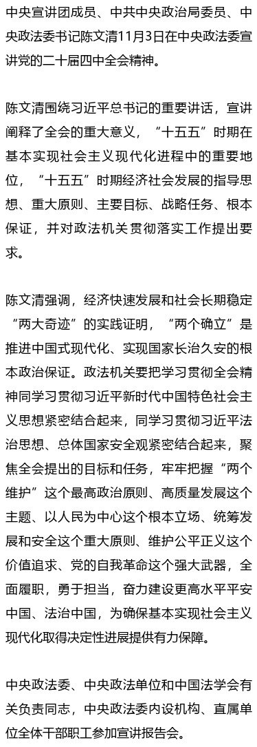 学习贯彻党的二十届四中全会精神中央宣讲团报告会在中央政法委举行