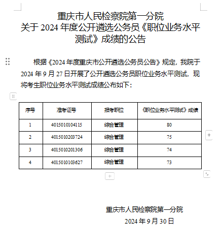 卡提诺论坛 第一分院关于2024年度公开遴选公务员《职位业务水平测试》成绩的公告