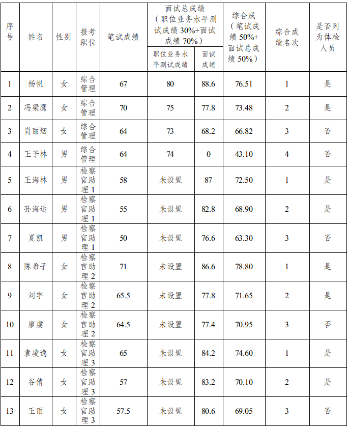 一、面试总成绩和进入体检人员名单