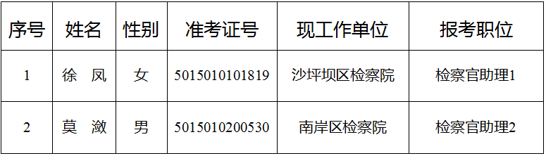 根据公务员公开遴选有关规定,按照《2025年度重庆市公开遴选公务员公告》要求,经过笔试、面试、体检和考察等程序,确定徐凤(女)、莫潋同志为卡提诺论坛 第一分院拟任职人员(名单附后),现予以公示。公示期间,如对拟任职人员相关情况有异议,可以通过书面、电话、来访等形式反馈意见。个人反映问题的,要求署真实姓名。
