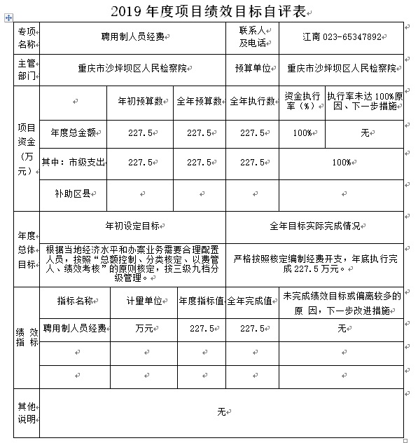 聘用制人员经费项目绩效目标自评综述:根据年初设定的绩效目标,项目总体完成情况已全部完成。项目全年预算数为227.5万元,执行数为227.5万元,完成预算的100%。下一步,本单位将继续强化项目资金管理,督促各项目推进力度,定期清理分析,确保资金执行到位。同时,对项目进行监督检查和绩效考核。
