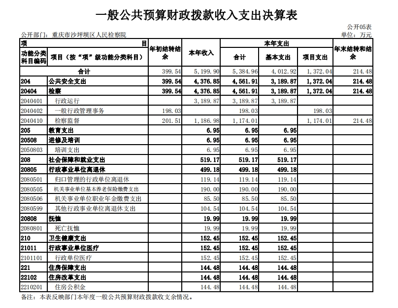 3.支出情况。2019年度支出合计5,405万元,较上年决算数增加114.1万元,增长2.16%,主要原因是2018年度中央政法专款支出了一部分。其中:基本支出4,012.92万元,占74.24%;项目支出1,392.07万元,占25.76%。