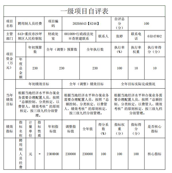 聘用制人员经费项目绩效目标自评综述:根据年初设定的绩效目标,项目总体完成情况已全部完成。项目全年(调整)预算数为230万元,执行数为230万元,完成预算的100%。