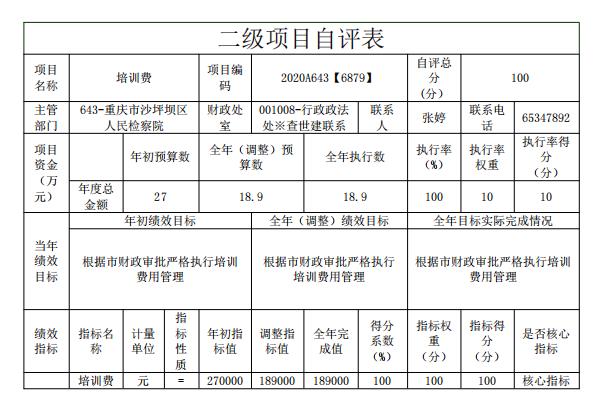 培训费项目绩效目标自评综述:根据年初设定的绩效目标,项目总体完成情况已全部完成。项目全年(调整)预算数为18.9万元,执行数为18.9万元,完成预算的100%。