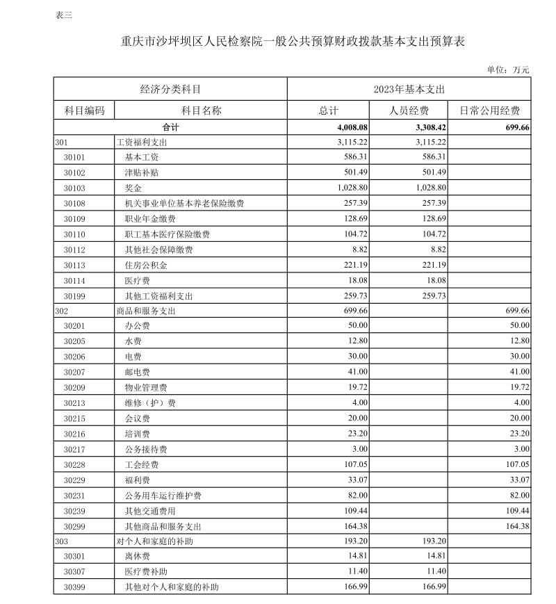 2023年一般公共预算财政拨款收入4825.08万元,一般公共预算财政拨款支出4825.08万元,比2022年增加599万元,其中:基本支出4008.08万元,比2022年增加852.4万元,主要原因是行政参公单位公用经费综合定额人均减少1万元,预算减少124.6万元;规范公务员津贴补贴改革后,公务员基础绩效奖和年度考核奖纳入年初预算编制,养老保险、职业年金、职工教育经费、福利费和住房公积金计提基数调整,年终一次性奖金规范编制等,共计增加801.61万元;未休假补贴等规范编制减少78.33万元;退休人员增加3人,增加13.72万元;聘用制书记员经费纳入基本支出编制,预算增加240万元;基本支出主要用于保障在职人员工资福利及社会保险缴费、离休人员离休费、退休人员补助等,保障部门正常运转的各项商品服务支出;项目支出817万元,比2022年减少253.4万元,主要原因是聘用制书记员经费纳入基本支出编制,预算减少240万元;减少检察公开听证室信息系统的建设项目,预算减少21.5万元;办公自动化运行维护费增加8.1万元;项目支出主要用于办案费、办公设备购置及其他项目支出等重点工作