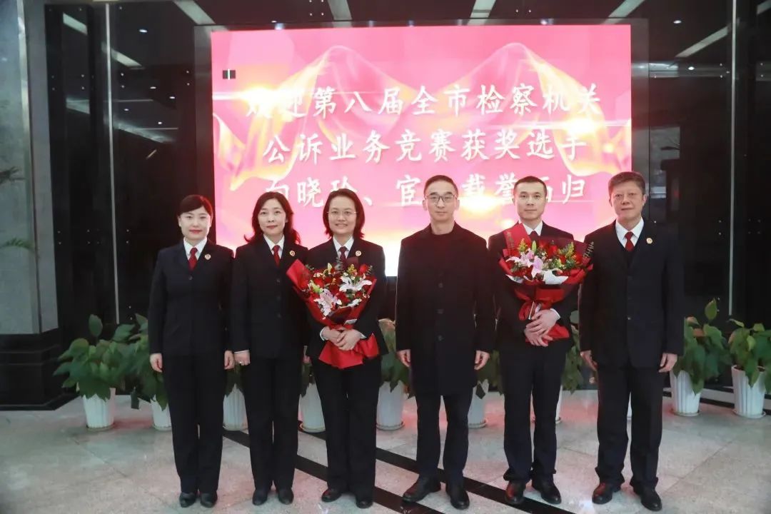 1月12日,院党组书记、检察长程权代表院党组向向晓玲同志、宦晓同志表示祝贺并合影留念。程权检察长对两位同志取得的成绩表示了肯定。他表示,此次竞赛考核了选手们的综合水平,希望全院干警能够继续强化业务素能,以获奖同志为榜样,找差距、补短板,不断提升履职能力,切实担起党和人民赋予的政治责任、法治责任和检察责任。